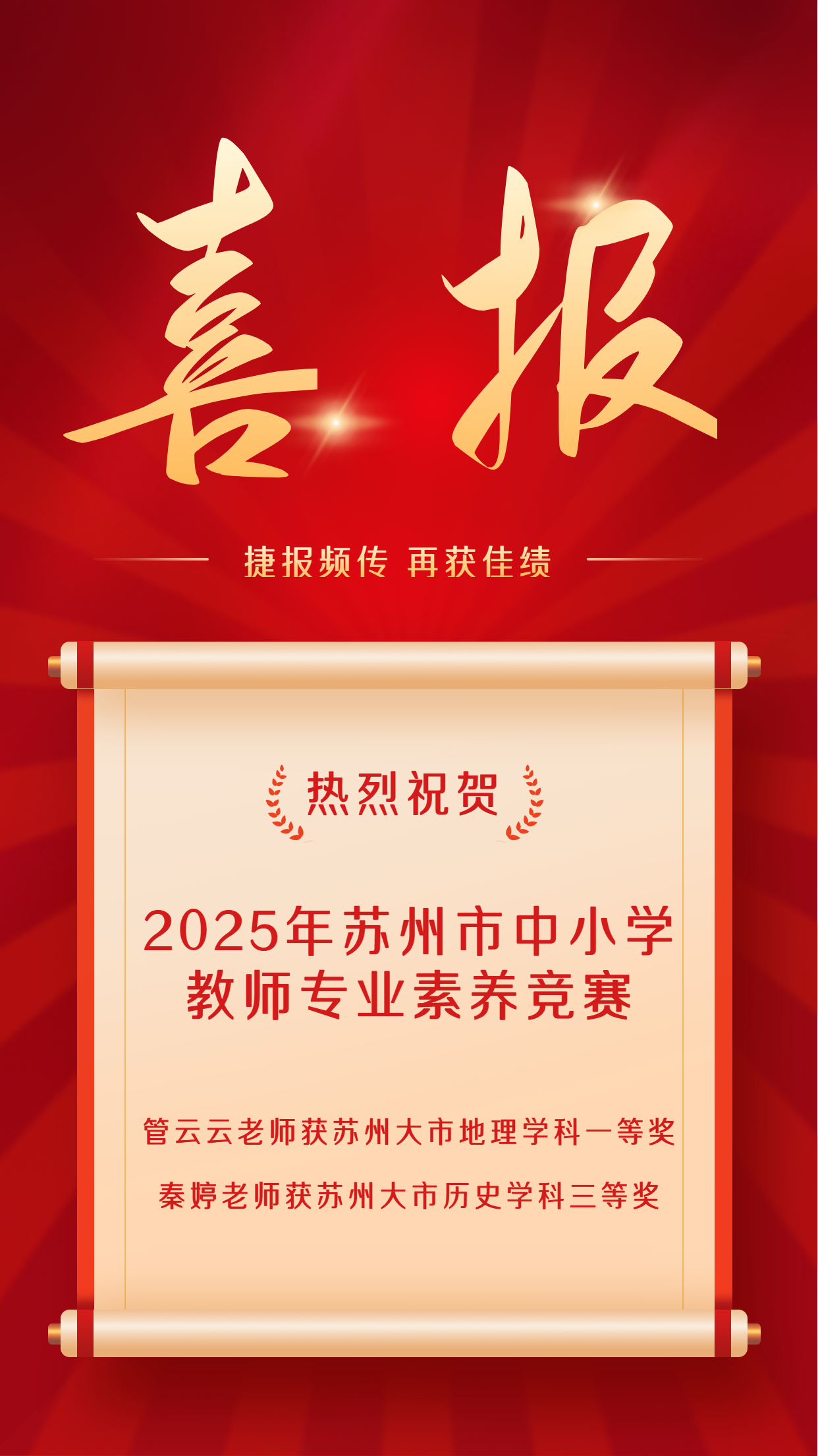在2025年苏州市中小学教师专业素养竞赛中,我校管云云老师获得苏州大市地理学科组素养竞赛一等奖、秦婷老师获得苏州大市历史学科组三等奖,双双获评专业素养“A等次”。