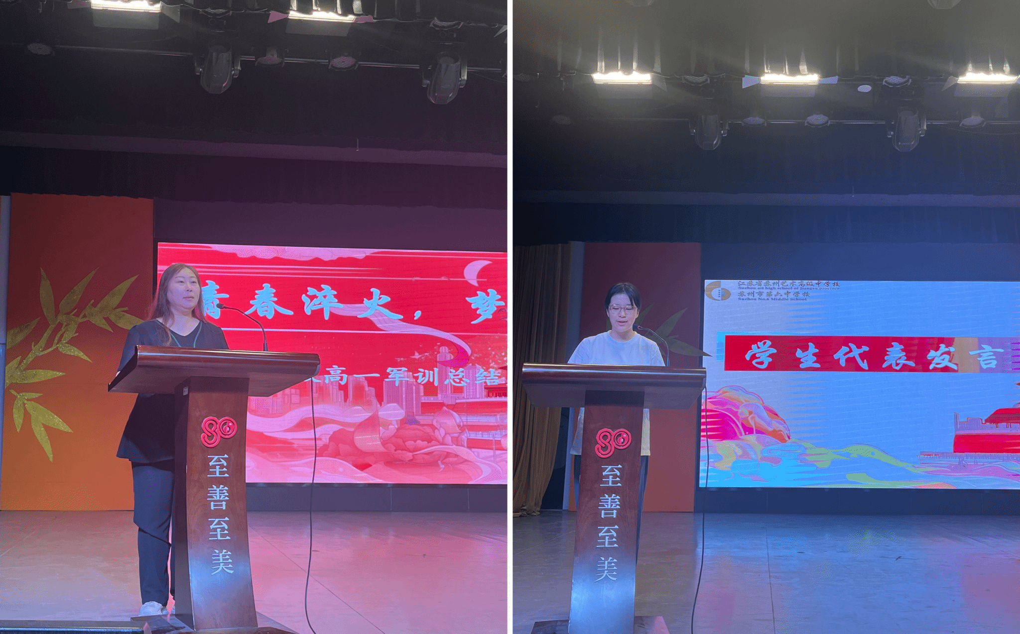 学校领导、全体教官共同见证了同学们的蜕变时刻。在休营仪式上,学生代表高一4班王晞羽上台发言,王晞羽同学分享了军训期间的收获,表达了对教官们的感恩。包峰圻教官作为教官代表做了发言,包教官肯定了同学们的军训表现,并对同学们寄予希望:希望同学们发扬军训精神,勤奋刻苦,为中华民族伟大复兴继续努力。