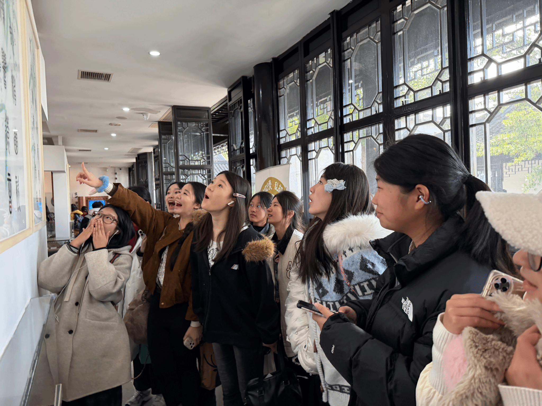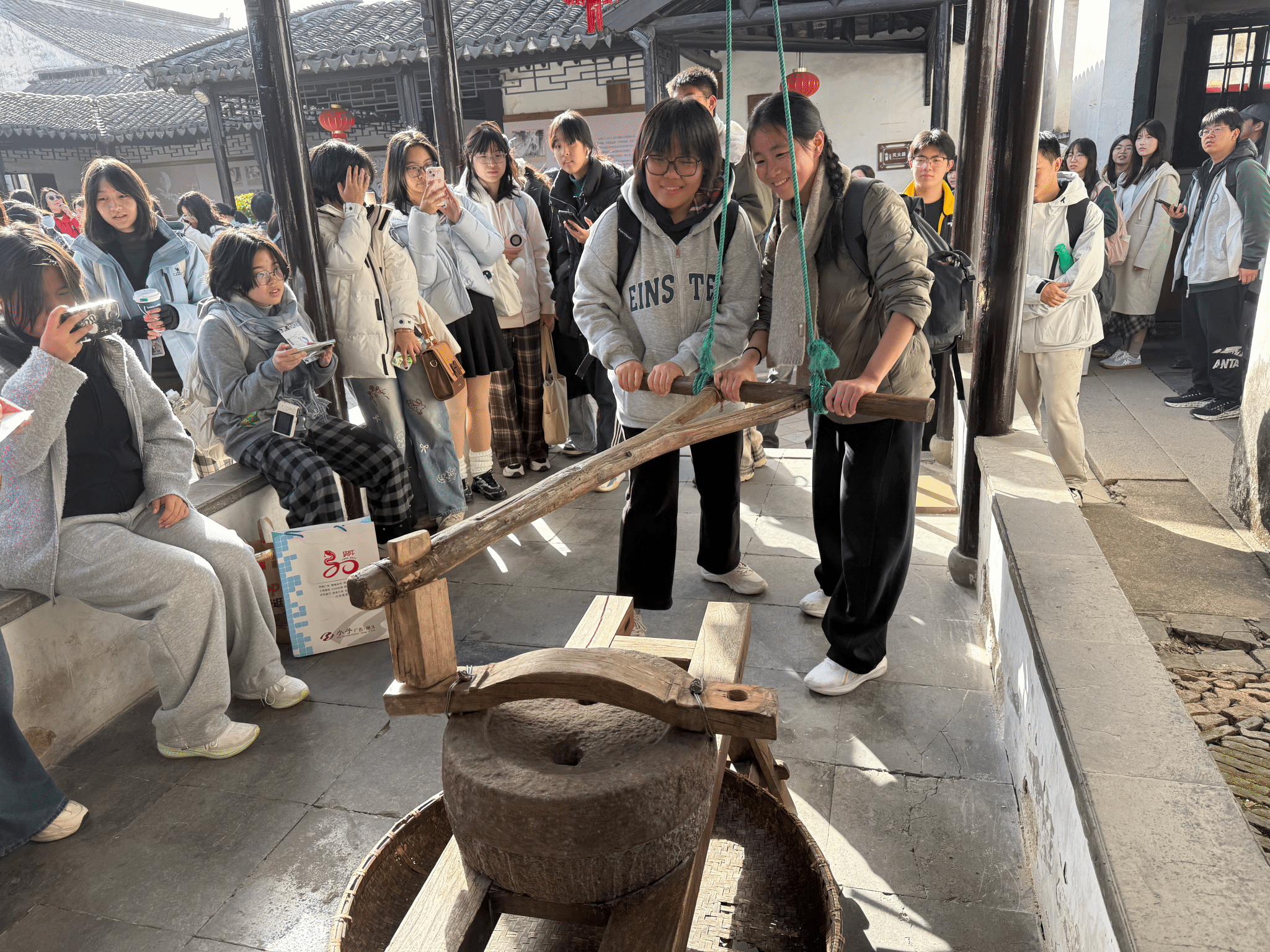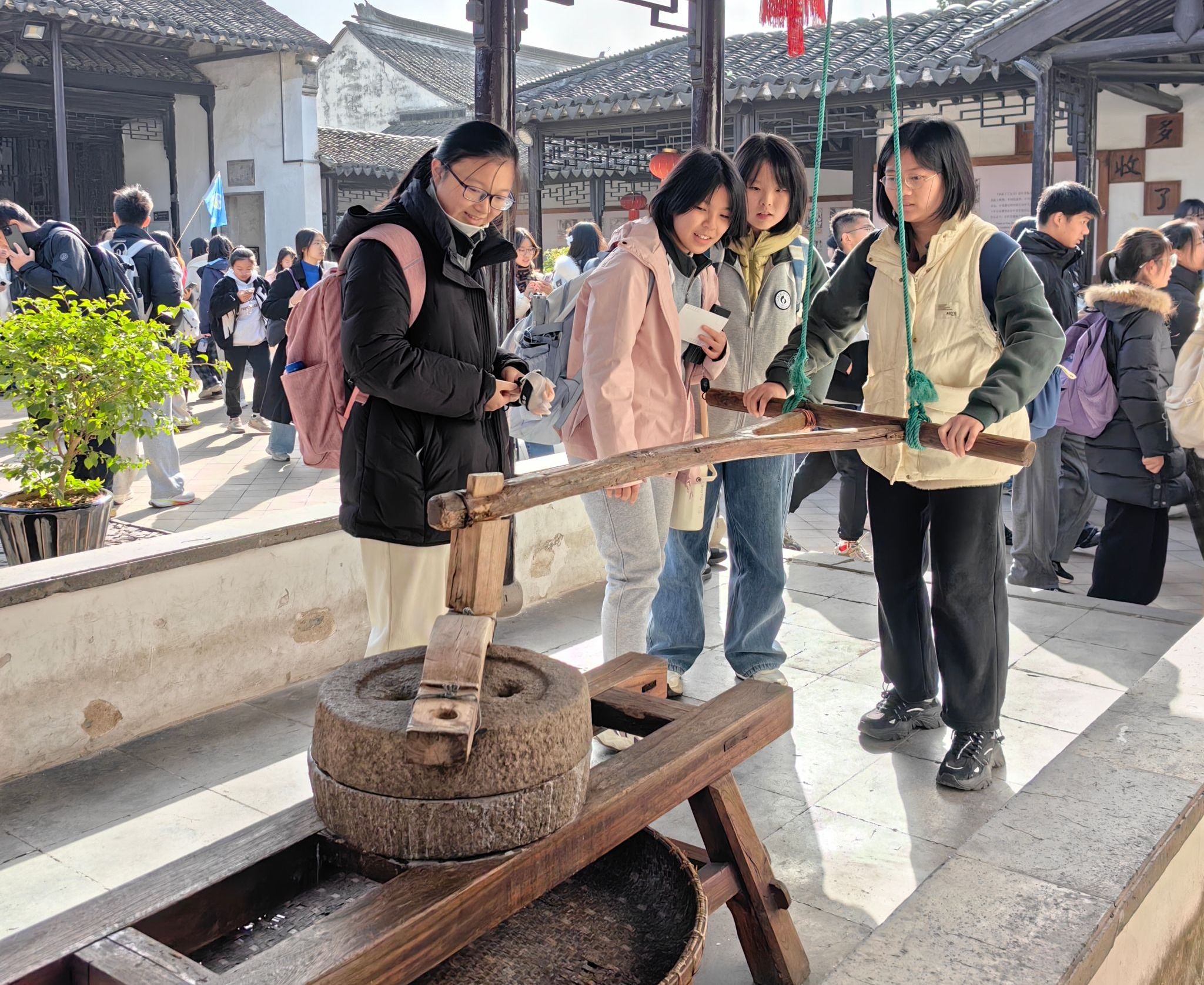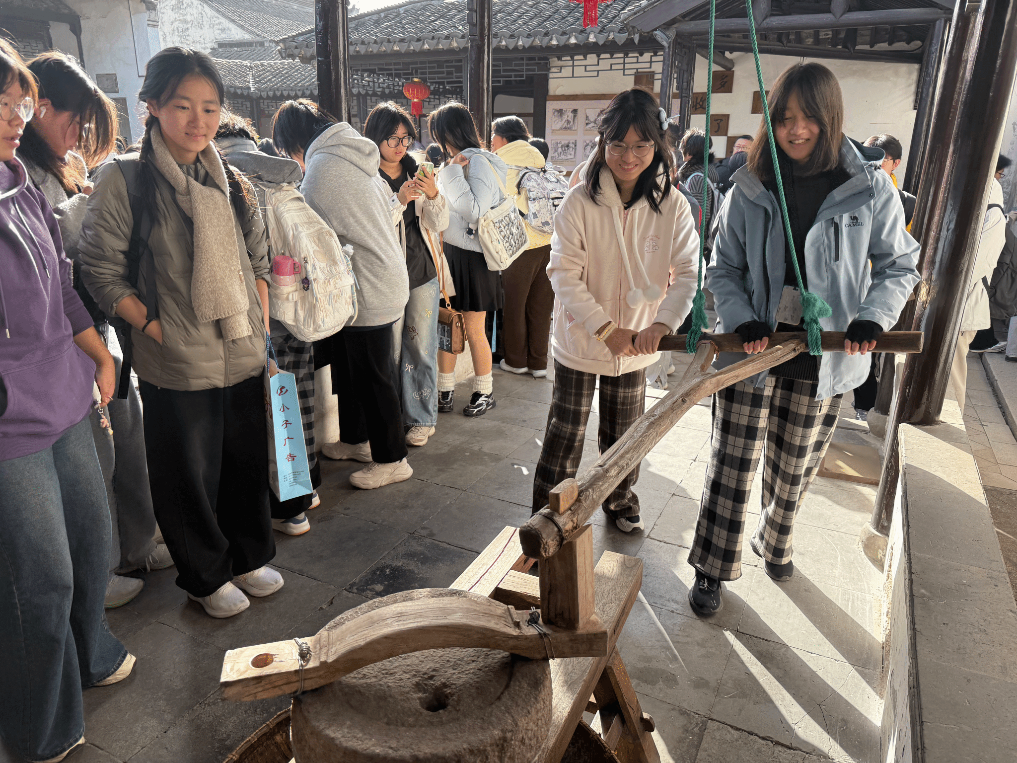 抵达甪直古镇后,在导游与老师的带领下,同学们开启了一场江南风情的探索。青石板被秋露打湿,泛着微光;白墙黛瓦下,红灯笼与黄银杏相映成趣;穿镇而过的小河里,乌篷船摇碎水面的倒影,也摇来了满船的桂花香。同学们不时驻足拍照留念,用镜头定格大自然的馈赠。
