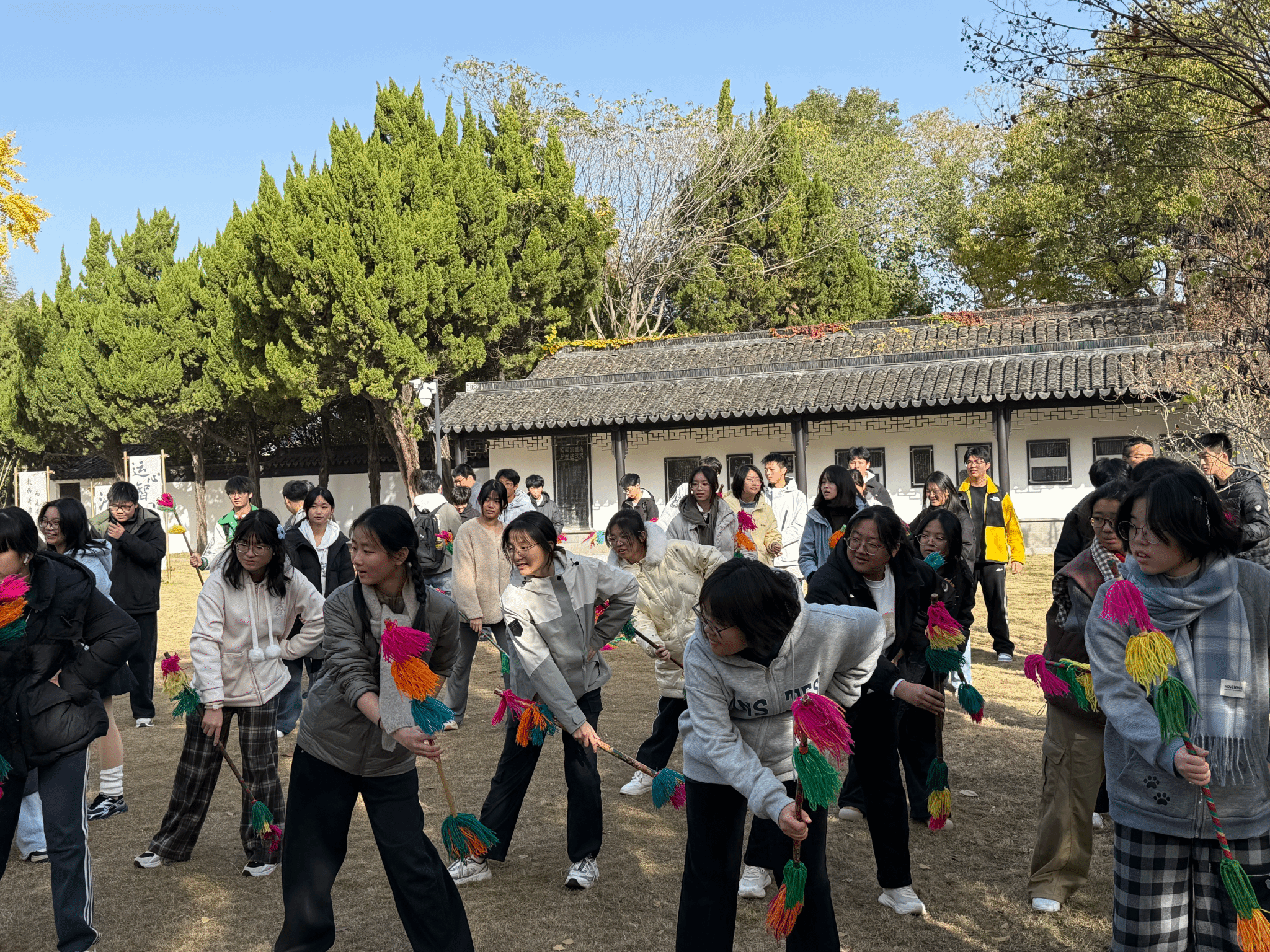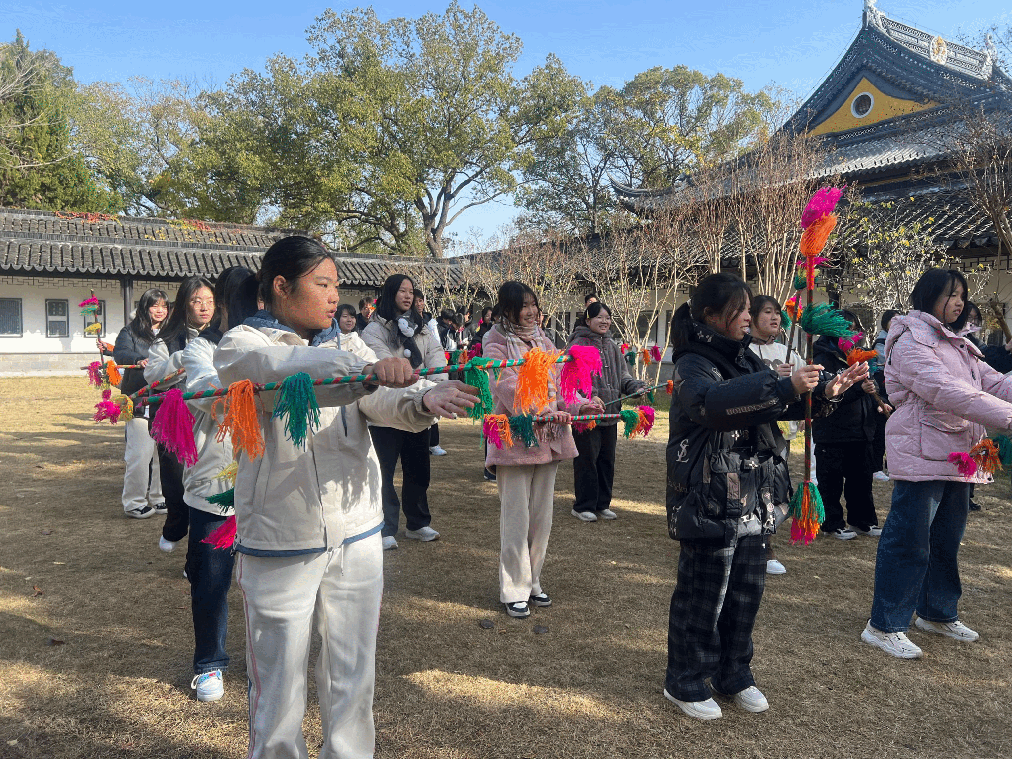 古银杏是甪直的“秋日名片”。树龄超千年的枝干遒劲有力,金黄的叶子层层叠叠,阳光穿过枝叶洒下,在地面织就一片“金毯”。同学们在千年银杏前跟着阿婆体验甪直水乡非遗舞蹈——“打连厢”。在甪直,打连厢充满江南风情,是甪直特色文化的展示。它与甪直水乡妇女服饰完美融合在一起,形成甪直独特的文化品牌。