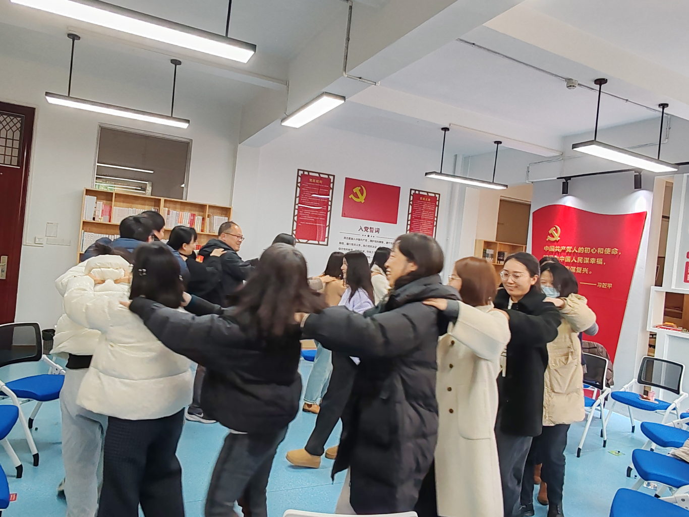 最后,活动在情绪疏通技巧,穴位轻敲和暖心的互相肩膀按摩中推向高潮。班主任们跟着节奏舒展身体,在彼此的关怀互动中传递温暖,现场氛围温馨而治愈。