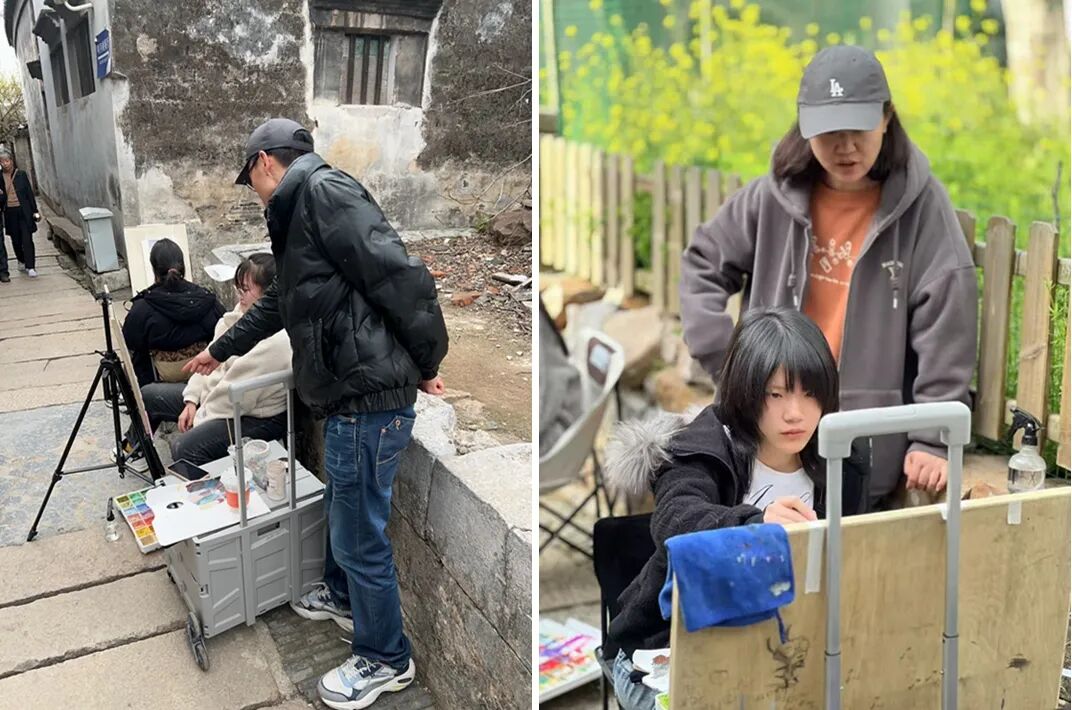 人间四月天,高二美术生用画笔定格江南诗意,在太湖西山岛深处的明月湾古村,千年古樟摇曳着斑驳树影,青石板路蜿蜒过明清老宅,这里的一砖一瓦都成为最生动的课堂。