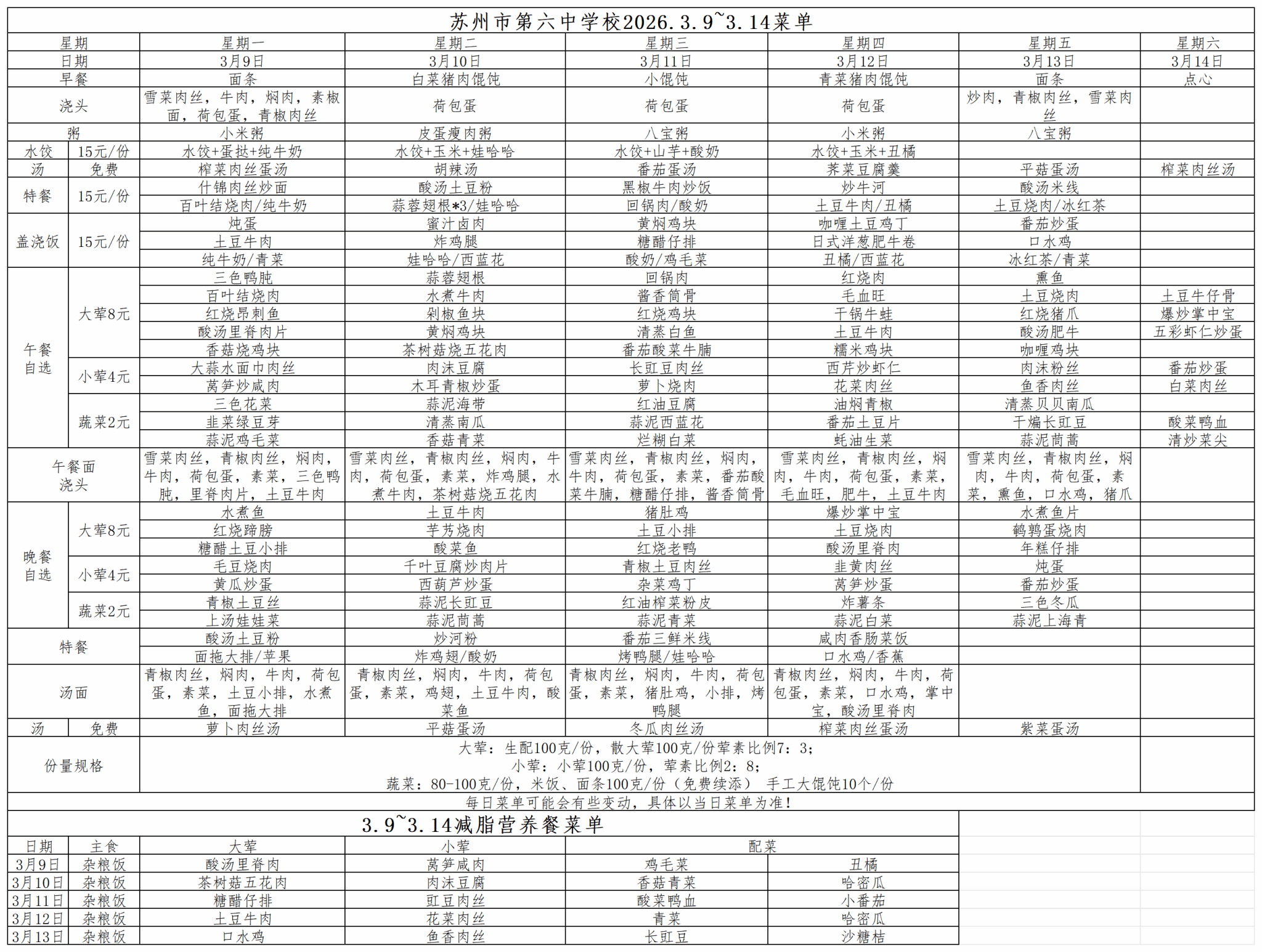 苏州市第六中学校2026.3.9~3.14菜单